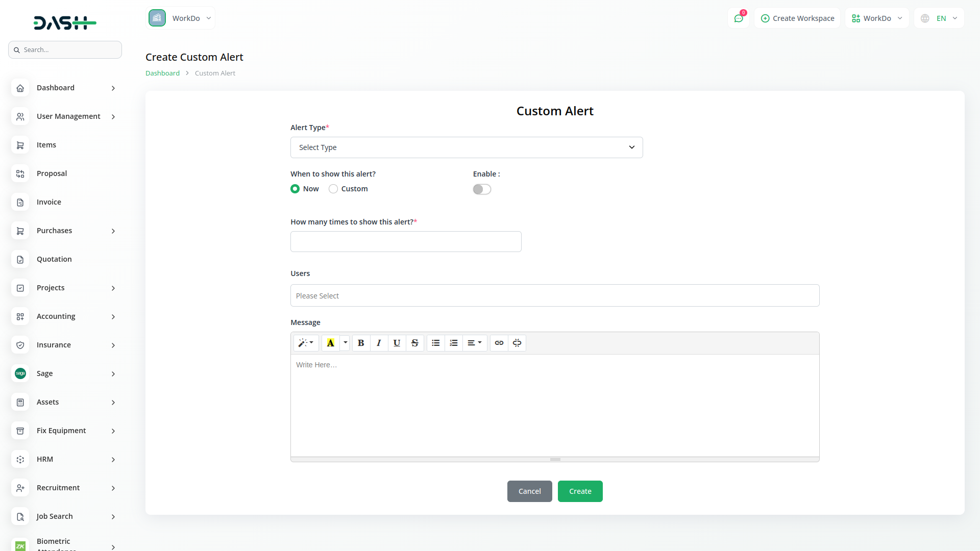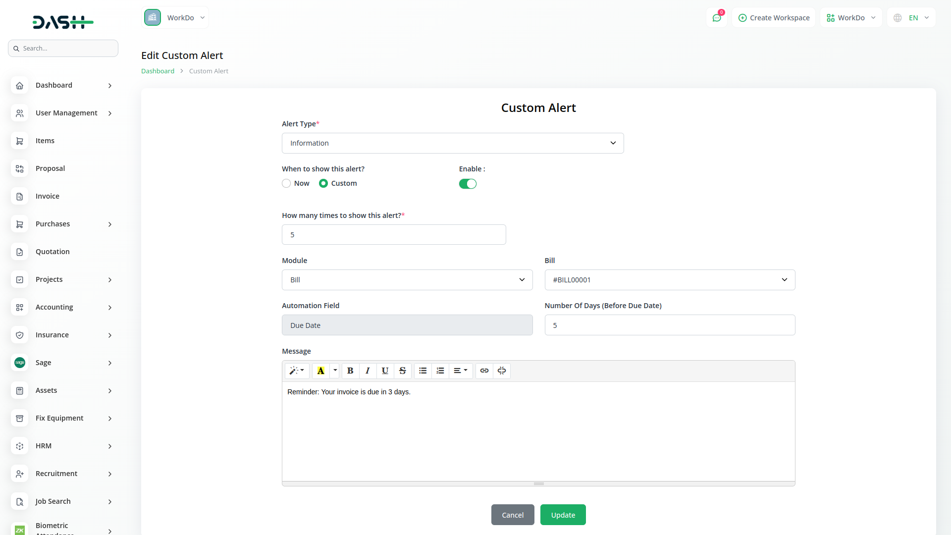 This Add-On lets you choose who sees the alert and when. Use the View Type setting to show the alert instantly or schedule it for a specific time and audience. You can link alerts to modules like General or Invoice. If Invoice is selected, you can choose a specific invoice to target. The alert is then shown only to users linked to that invoice, making your communication more focused and relevant.