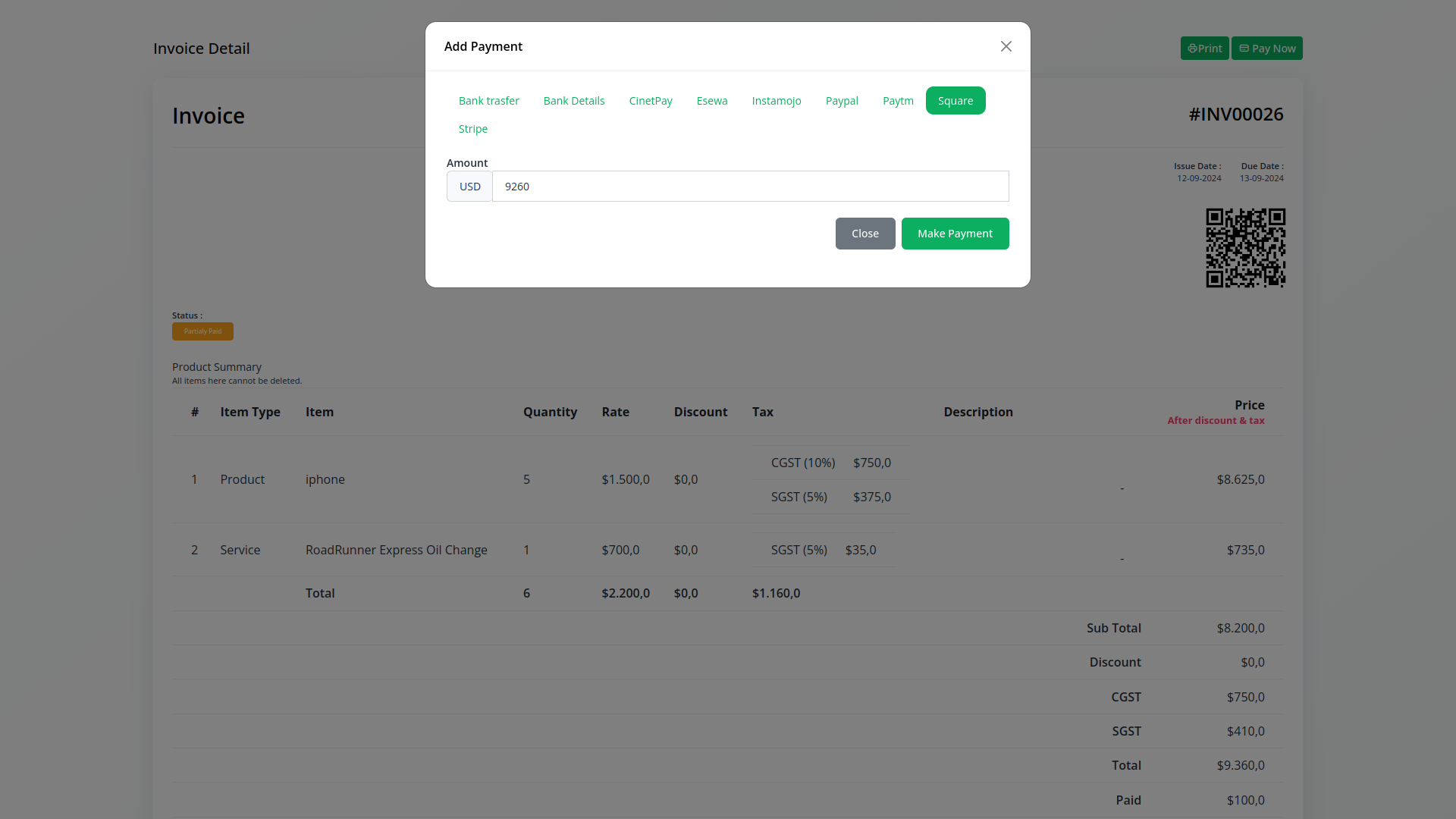 Invoices & Plan Payments Using Square Payment